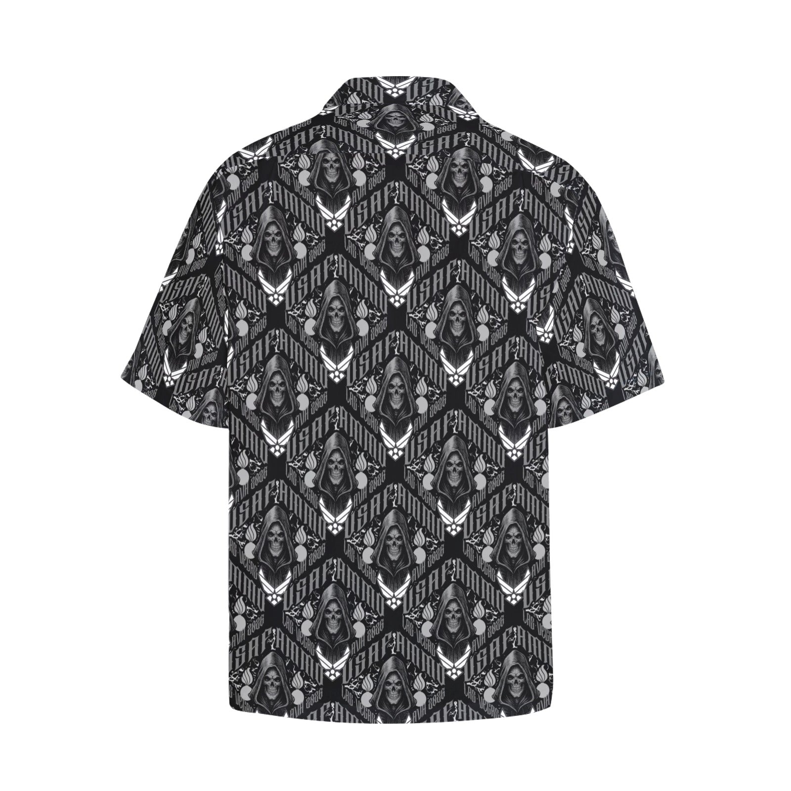 Features a repeating diamond shaped pattern all over the shirt consisting of the words USAF AMMO Las Vegas AVA 2026. It has a grim reaper, two pisspots and an AF vector logo inside of each diamond pattern.